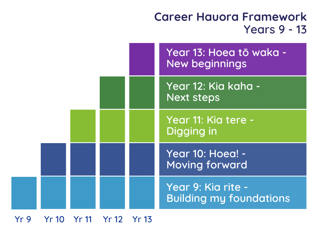 Career Hauora is a long-term initiative that is structured across a Year 9 to 13 framework, tailored to meet individuals at their age and life stage. The collaborative and co-created programme includes over 350 resources, videos, slideshows, worksheets and information guides. Designed from a holistic approach using Te Whare Tapa Whā model of hauora (wellbeing), Career Hauora is delivered by subject teachers in form/hauora time, making careers and life skills education accessible to every student.